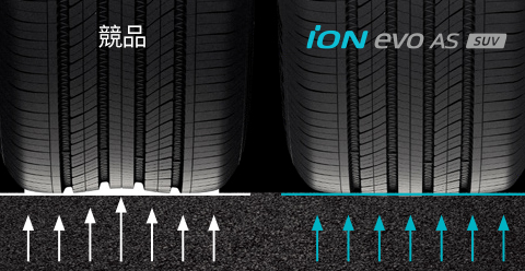 額外電池重量使得電動車比燃油車重約 30%,這會導致輪胎磨耗不均勻。iON evo AS SUV 採用優化接地面積的特殊結構來平均分配壓力,均勻的胎面磨耗可以提升輪胎的使用壽命。